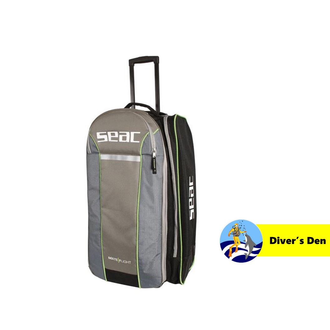 High-capacity trolley, extremely spacious, designed to ensure practicality and light weight. Equipped with two side pockets for fins with drainage, one front pocket and spacious inner pockets in the main compartment.